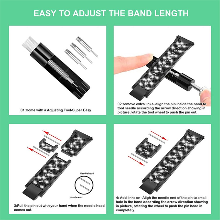 Das Armband aus hochwertigem Legierungs-Material besticht durch seine feine Verarbeitung und die schimmernden Rhinestones-Dekoration, die es zu einem eleganten Accessoire macht. Dank der widerstandsfähigen und anti-schwitzenden Eigenschaften ist es angenehm zu tragen und behält seinen Glanz über lange Zeit. Mit dem mitgelieferten Werkzeug-Set lässt es sich einfach installieren und entfernen, und es passt perfekt zu verschiedenen Smartwatch-Modellen wie der Samsung Galaxy Watch3 und der Huawei Watch GT.