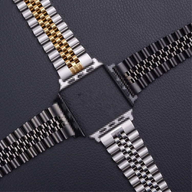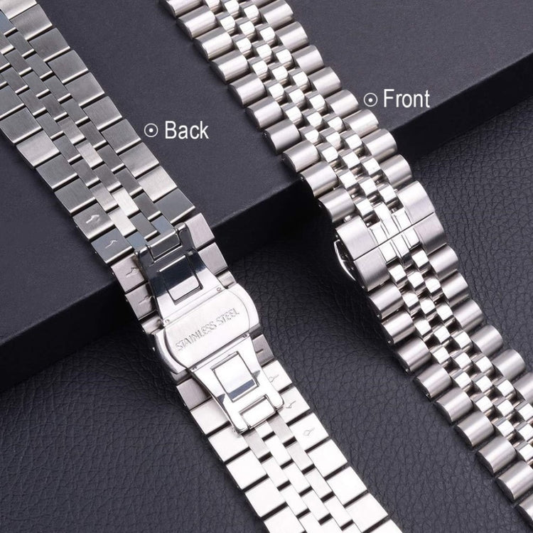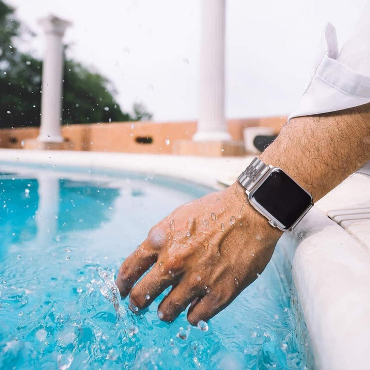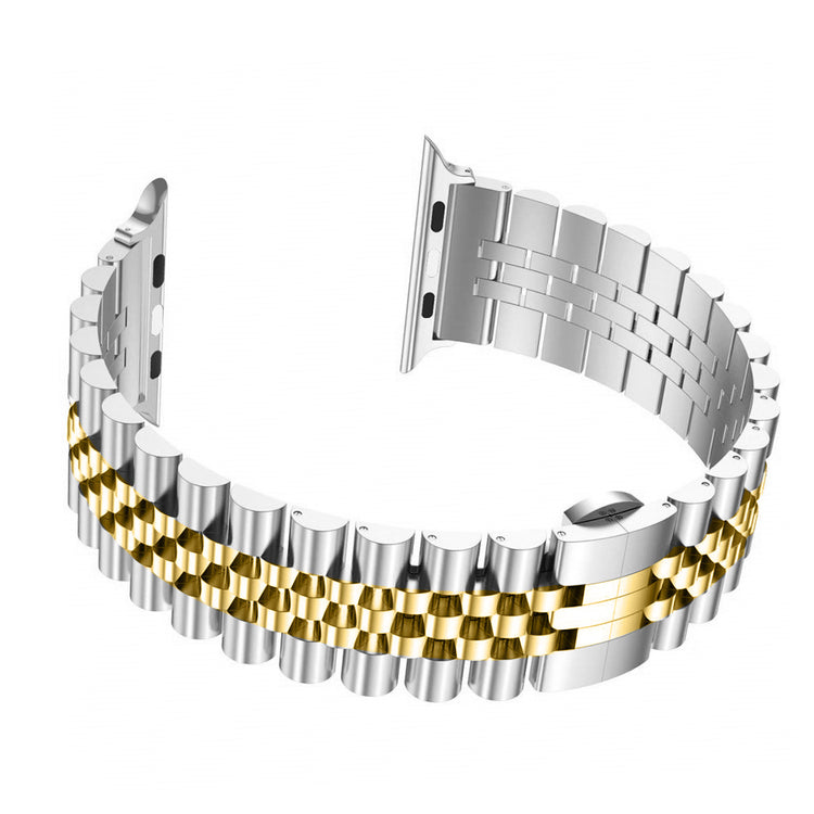 Dieses 5-gliedrige Edelstahlarmband ist kompatibel mit der Apple Watch Series 9 / 8 / 7 41mm / 6 / SE (2023) / SE (2022) / SE / 5 / 4 40mm / 3 / 2 / 1 38mm. Es bietet Komfort, Stabilität und Langlebigkeit.