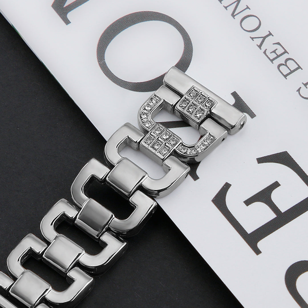 Das Armband aus Edelstahl im D-Ketten-Design verleiht Ihrer Smartwatch einen eleganten Look. Funkelnde Rhinestone-Verzierungen sorgen für luxuriöse Akzente und machen das Tragen zu einem stilvollen Erlebnis. Mit einem ergonomischen Design und einem einfachen Verschluss ist das Armband sowohl komfortabel als auch praktisch im Gebrauch.