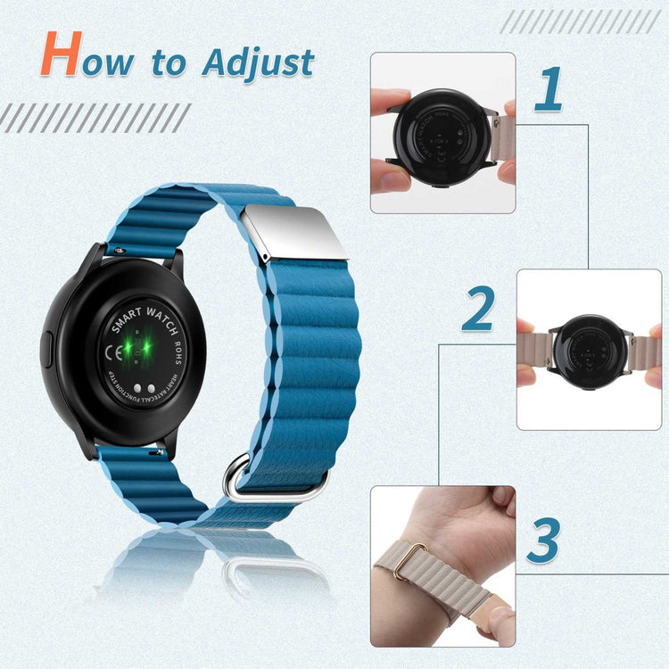 Dieses 20 mm breite Uhrenarmband aus echtem Leder mit Magnetverschluss bietet einen stilvollen und komfortablen Tragekomfort für Ihre Smartwatch. Die Länge des Armbands lässt sich dank des magnetischen Designs flexibel anpassen und ist somit für jedes Handgelenk von 14 cm bis 22 cm Umfang geeignet.