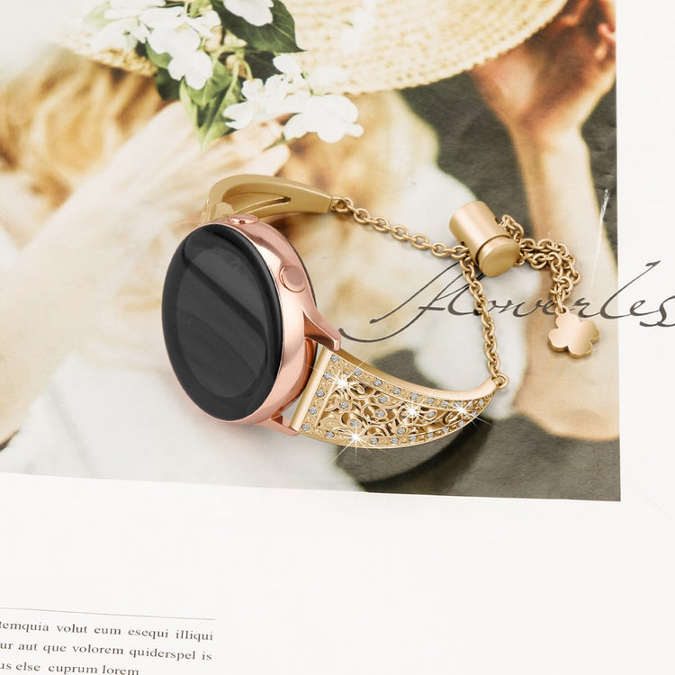 Entscheiden Sie sich für das 22mm Blumenarmband mit Rhinestone-Dekor, um Ihrem Smartwatch-Look einen Hauch von Eleganz zu verleihen. Hergestellt aus hochwertigem Zinklegierungs-Material, bietet dieses Armband nicht nur eine glatte und komfortable Passform, sondern auch ein stilvolles Design, das hervorragend mit jeder Art von Schmuck harmoniert. Dank des verstellbaren Kettenmetallverschlusses können Sie das Armband ganz einfach ohne Werkzeuge an Ihre Handgelenksgröße von 5,5 bis 8,1 Zoll anpassen. Es ist eine ausgezeichnete Wahl als Ersatz für beschädigte oder unbrauchbare Armbänder und eignet sich perfekt für Arbeit, Freizeit oder tägliche Anlässe. Das Armband wiegt nur 22,4 g, was es angenehm zu tragen macht. Es ist kompatibel mit zahlreichen Smartwatches, darunter die Samsung Galaxy Watch 3 und 46mm, Samsung Gear S3 Classic und Frontier, sowie mehrere Modelle von Huawei und Xiaomi. Gönnen Sie sich dieses stilvolle Accessoire und verwandeln Sie den Look Ihrer Smartwatch!