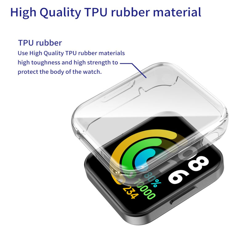 Das vollständige TPU Smartwatch Schutzgehäuse mit TPU Bildschirmschutz für die Xiaomi Redmi Watch 2 sorgt für optimalen Schutz vor Stößen und Stürzen. Durch das transparente Design bleibt die originale Schönheit Ihrer Uhr sichtbar, während der integrierte Bildschirmschutz kratzfest und widerstandsfähig ist. Mit einem Gewicht von nur 3g bleibt das Gehäuse schlank und beeinträchtigt nicht die Ladefunktion.