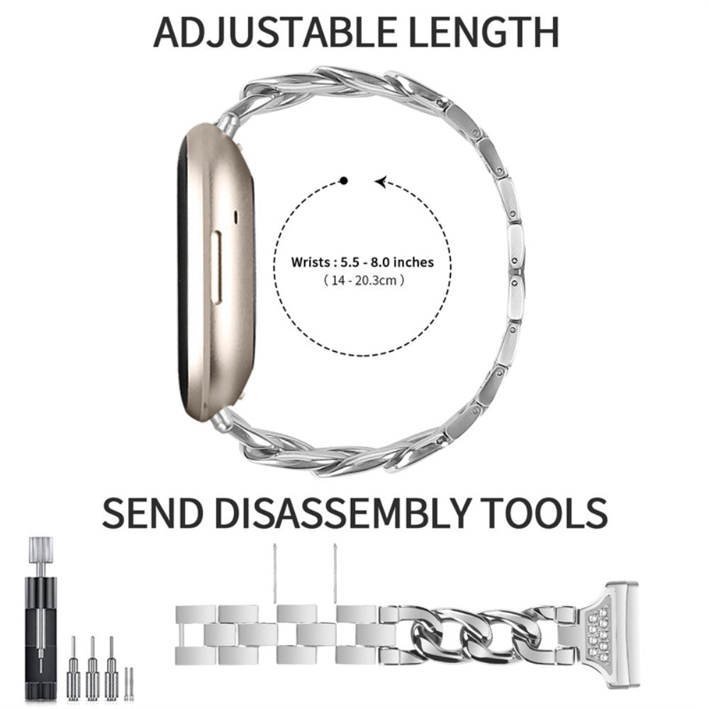 Entscheiden Sie sich für unseren hochwertigen Metall-Uhrenarmband Ersatz für die Fitbit Versa 4 / Sense 2 und verleihen Sie Ihrer Smartwatch eine neue, glamouröse Note. Gefertigt aus hochwertigem Metall, überzeugt dieses Armband durch seine Langlebigkeit und die stilvolle Verzierung mit Rhinestones, die nicht nur robust, sondern auch ansprechend ist. Es ist ein wahres Augenhighlight und bringt einen zeitlos eleganten Stil, der sich perfekt für besondere Anlässe eignet. Egal, ob Hochzeit, Geburtstag, Valentinstag oder zum Muttertag – dieses luxuriöse Armband ist ein wunderbares Geschenk für Ihre Freundinnen oder Ihre Partnerin. Das Armband ist für Handgelenke von 5.5” bis 8.0” (140mm-203mm) geeignet und ermöglicht es Ihnen, Ihren persönlichen Stil auszudrücken. Genießen Sie die Vielfalt und Eleganz, die unser Uhrenarmband Ihrer Smartwatch verleiht!