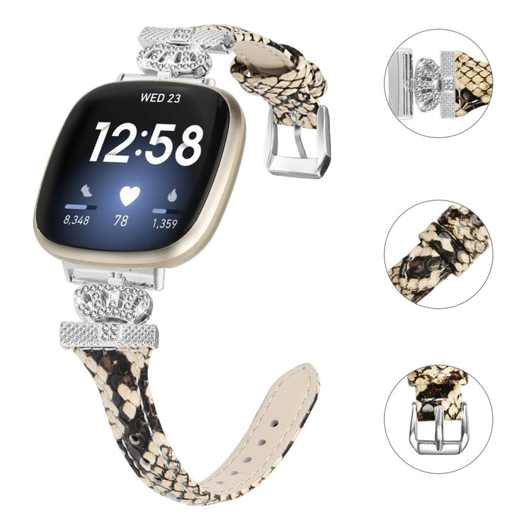 Entscheiden Sie sich für das Armband aus hochwertigem Rindsleder für Ihre Fitbit Versa 3 / 4 / Sense / Sense 2 und genießen Sie den komfortablen Tragekomfort. Dieses elegante Armband lässt sich mühelos mit Ihrer täglichen Outfits kombinieren und verleiht Ihrer Smartwatch durch die kronenförmigen Verbindungselemente und funkelnden Strassverzierungen einen stilvollen Touch. Dank des mehrfachen Lochdesigns können Sie die Größe des Armbands ganz einfach anpassen, was es äußerst praktisch macht. Mit einer hochwertigen Edelstahl-Schnalle ausgestattet, bietet das Armband nicht nur Langlebigkeit, sondern ist auch eine ideale Ergänzung für Ihr altes oder beschädigtes Armband. Ob bei der Arbeit, in der Freizeit oder bei anderen täglichen Anlässen – dieses Armband eignet sich perfekt für sowohl Frauen als auch Männer.